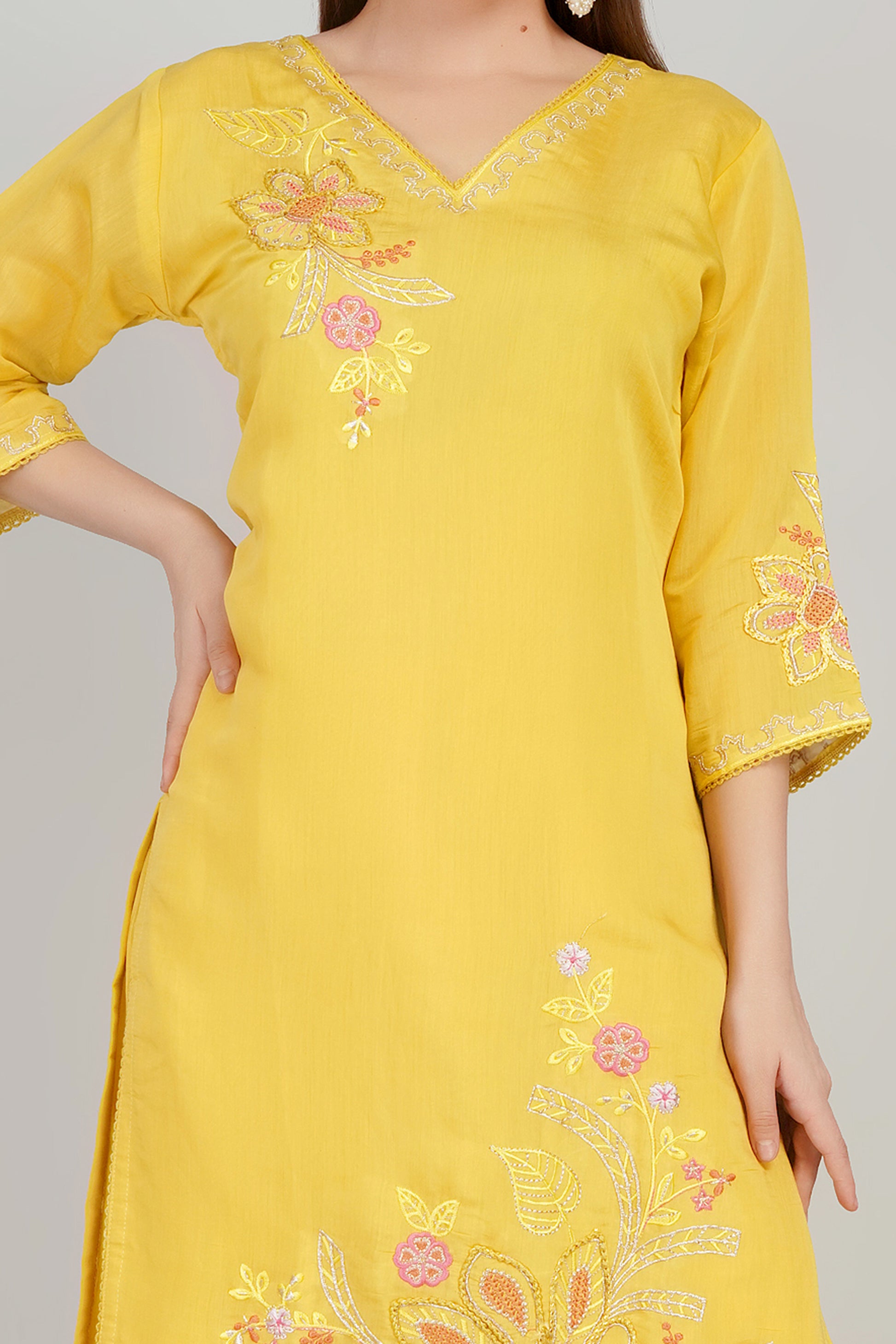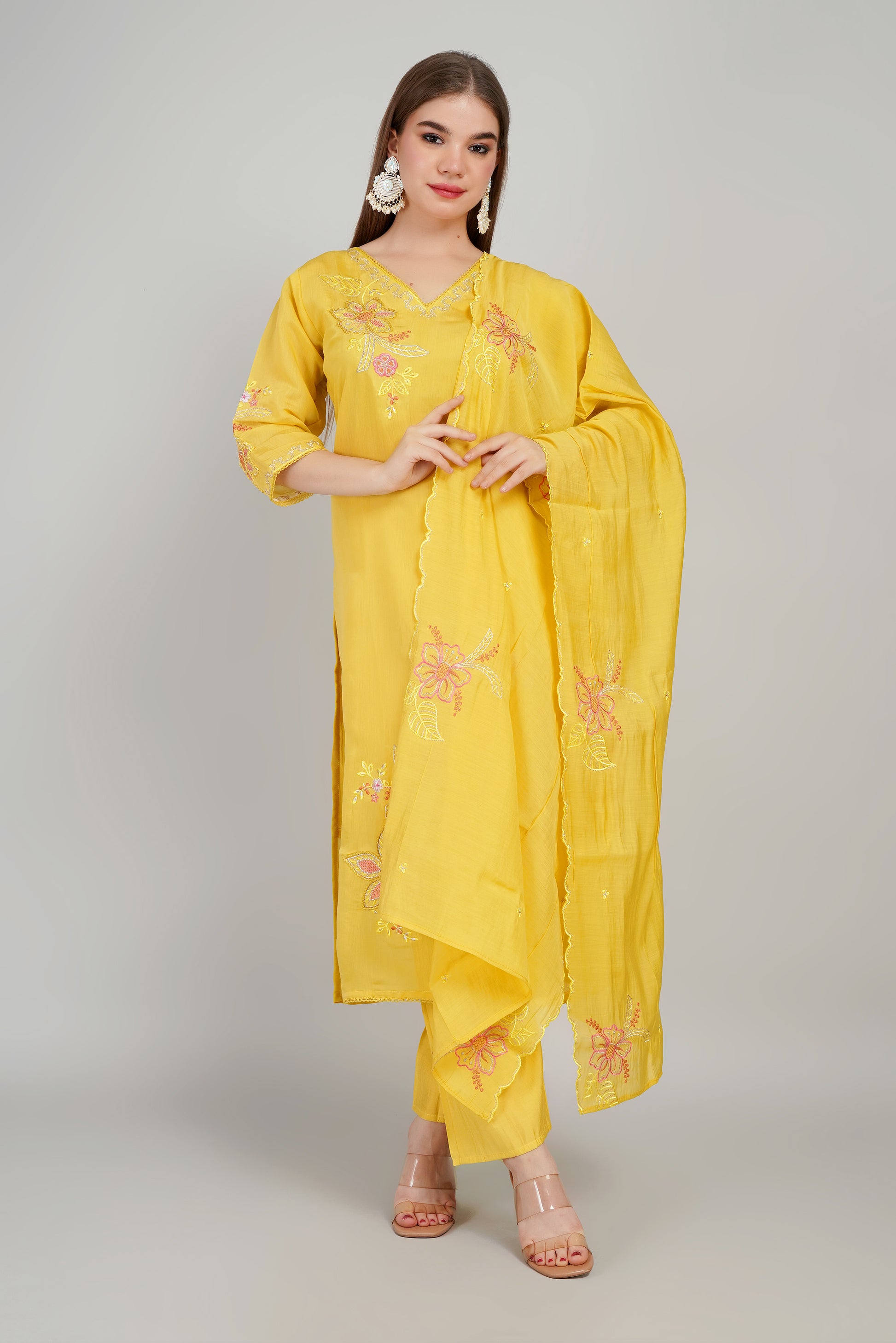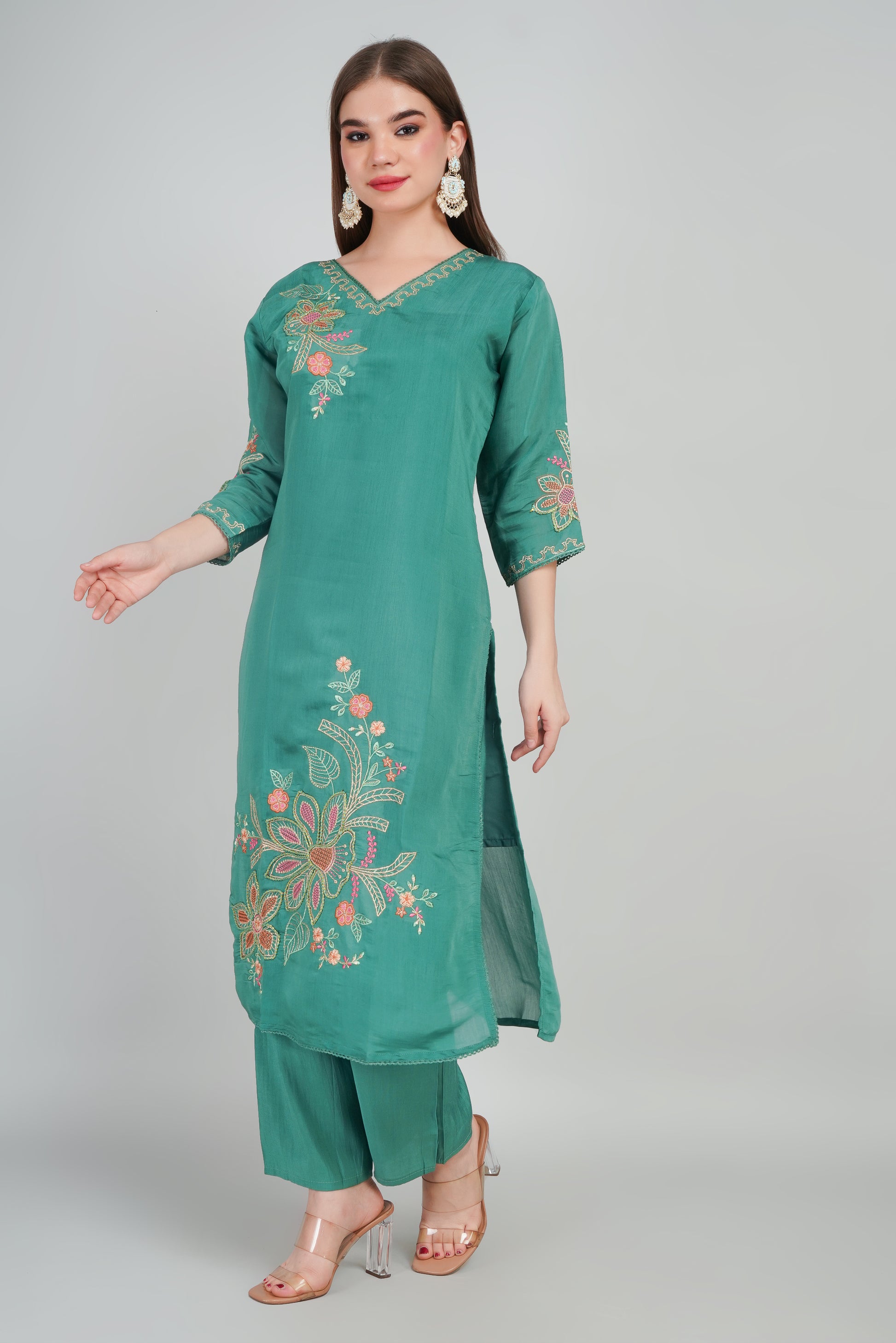 Elevate your ethnic wardrobe with this elegant Designer Kurti Set crafted in premium Mul Chanderi fabric. Known for its lightweight texture and subtle sheen, mul chanderi ensures comfort with a touch of sophistication.
